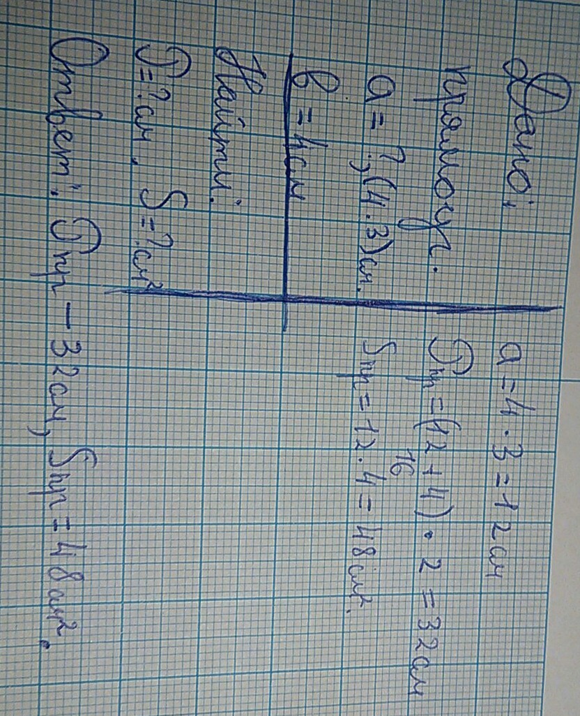 у прямоугольника ширина в 3 раза меньше длины. Ширина этого прямоугольника 4 см.найди периметр и площадь прямоугольника! помогите с дано и решением на бумажке