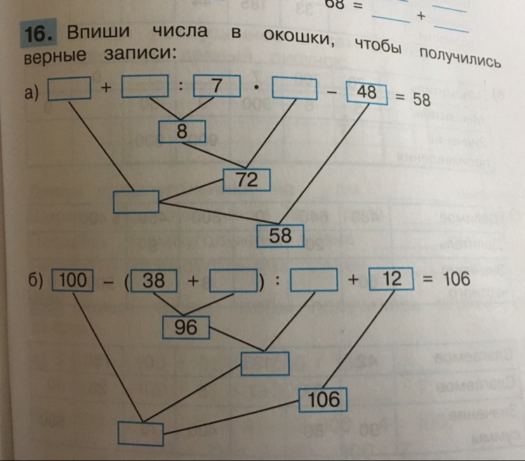б) 100-(38+58):16+12=106 (в "окошко" посередине надо вставить 6, внизу - 94).