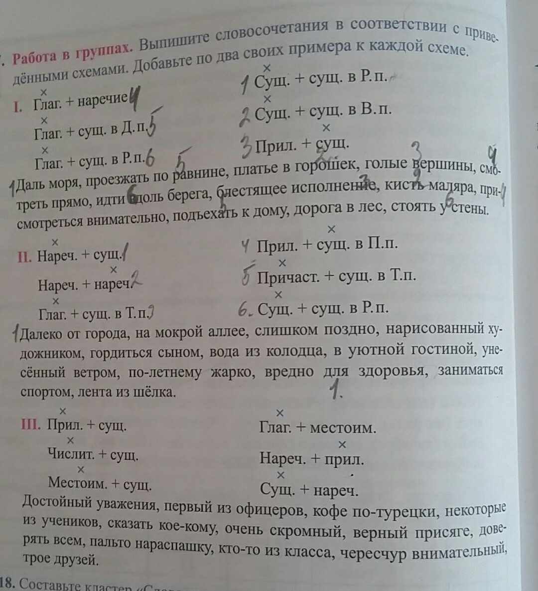 Глаг + сущ. в р.п. Идти вдоль берега, стоять у стены,.Прил . + сущ. Голые вершины,блестящее исполнение