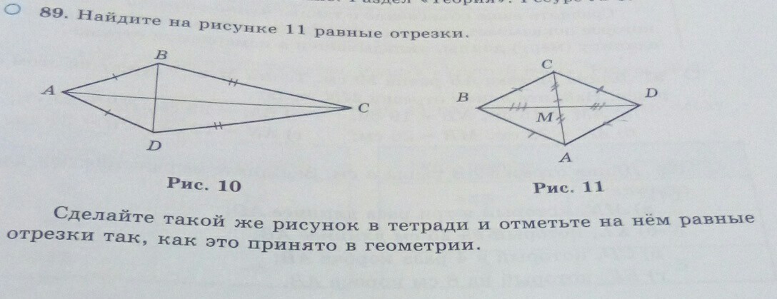 Отмеченные одинаковым кол-вом черточек отрезки и будут равные. Например, ВС и СД