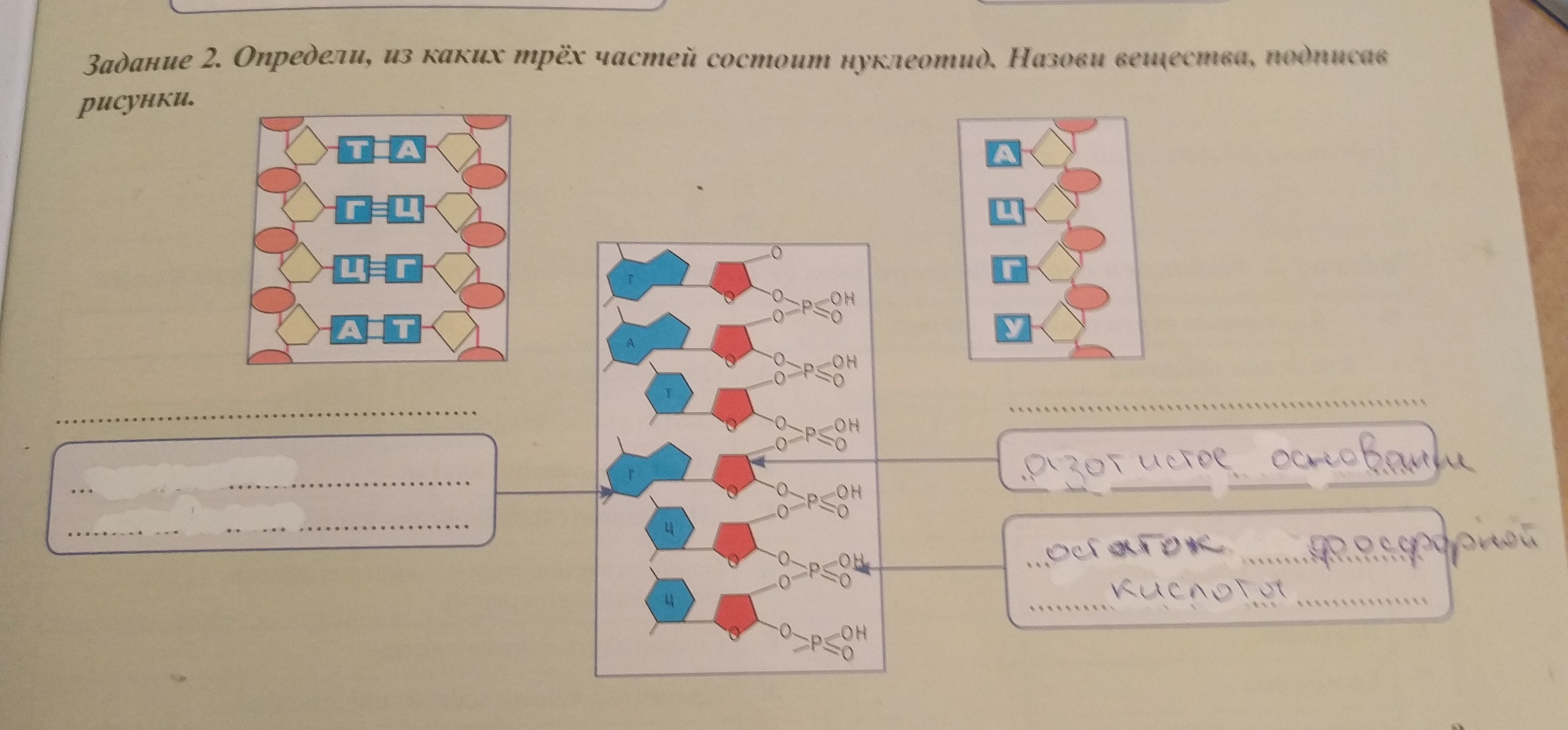 определи, из каких трёх частей состоит нуклеотид. назови вещества, подписав рисунки.