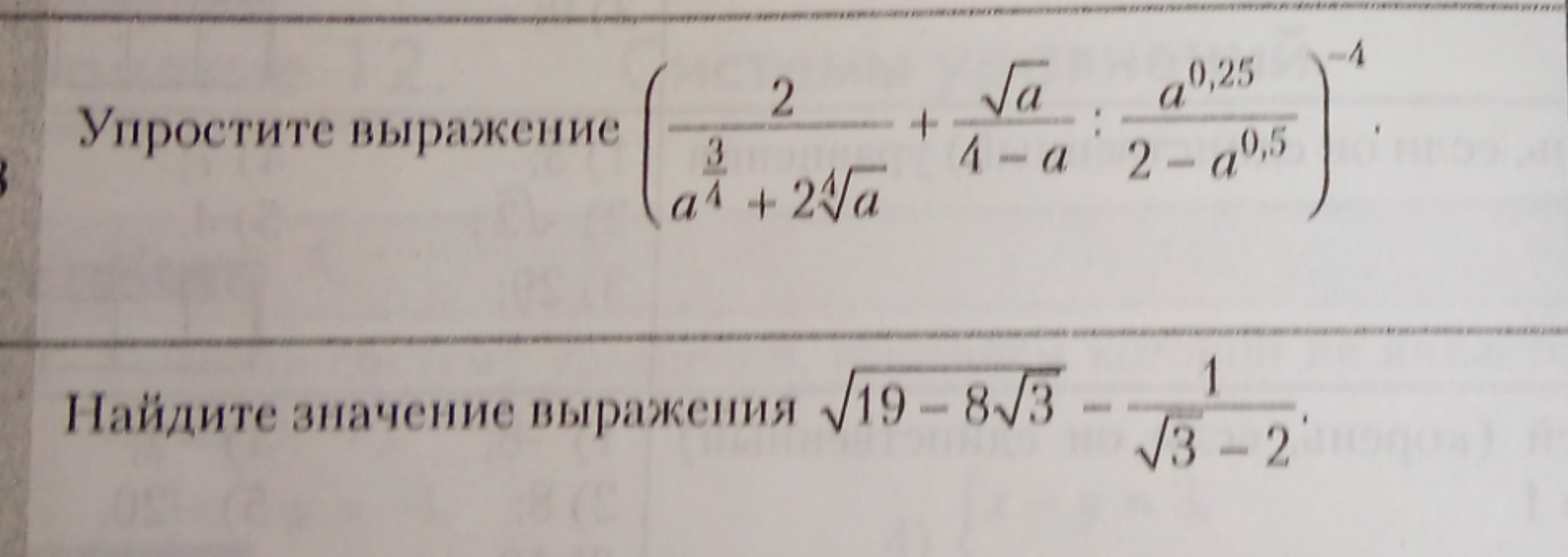 ![(frac{2}{a^{frac{3}{4}}+2sqrt[4]{a}}+frac{sqrt{a}}{4-a}:frac{a^{0.25}}{2-a^{0.5}})^{-4} = \\ =(frac{2}{sqrt[4]{a^3}+2sqrt[4]{a}}+frac{sqrt{a}}{(2-sqrt{a})(2+sqrt{a})}:frac{sqrt[4]{a}}{2-sqrt{a}})^{-4} = \\ =(frac{2}{sqrt{a}sqrt[4]{a}+2sqrt[4]{a}}+frac{sqrt[4]{a^2}}{(2-sqrt{a})(2+sqrt{a})}*frac{2-sqrt{a}}{sqrt[4]{a}})^{-4} = \\ =(frac{2}{sqrt[4]{a}(2+sqrt{a})}+frac{sqrt[4]{a}}{2+sqrt{a}})^{-4} = \\ (frac{2}{a^{frac{3}{4}}+2sqrt[4]{a}}+frac{sqrt{a}}{4-a}:frac{a^{0.25}}{2-a^{0.5}})^{-4} = \\ =(frac{2}{sqrt[4]{a^3}+2sqrt[4]{a}}+frac{sqrt{a}}{(2-sqrt{a})(2+sqrt{a})}:frac{sqrt[4]{a}}{2-sqrt{a}})^{-4} = \\ =(frac{2}{sqrt{a}sqrt[4]{a}+2sqrt[4]{a}}+frac{sqrt[4]{a^2}}{(2-sqrt{a})(2+sqrt{a})}*frac{2-sqrt{a}}{sqrt[4]{a}})^{-4} = \\ =(frac{2}{sqrt[4]{a}(2+sqrt{a})}+frac{sqrt[4]{a}}{2+sqrt{a}})^{-4} = \\](https://tex.z-dn.net/?f=%28frac%7B2%7D%7Ba%5E%7Bfrac%7B3%7D%7B4%7D%7D%2B2sqrt%5B4%5D%7Ba%7D%7D%2Bfrac%7Bsqrt%7Ba%7D%7D%7B4-a%7D%3Afrac%7Ba%5E%7B0.25%7D%7D%7B2-a%5E%7B0.5%7D%7D%29%5E%7B-4%7D+%3D+%5C%5C+%3D%28frac%7B2%7D%7Bsqrt%5B4%5D%7Ba%5E3%7D%2B2sqrt%5B4%5D%7Ba%7D%7D%2Bfrac%7Bsqrt%7Ba%7D%7D%7B%282-sqrt%7Ba%7D%29%282%2Bsqrt%7Ba%7D%29%7D%3Afrac%7Bsqrt%5B4%5D%7Ba%7D%7D%7B2-sqrt%7Ba%7D%7D%29%5E%7B-4%7D+%3D+%5C%5C+%3D%28frac%7B2%7D%7Bsqrt%7Ba%7Dsqrt%5B4%5D%7Ba%7D%2B2sqrt%5B4%5D%7Ba%7D%7D%2Bfrac%7Bsqrt%5B4%5D%7Ba%5E2%7D%7D%7B%282-sqrt%7Ba%7D%29%282%2Bsqrt%7Ba%7D%29%7D%2Afrac%7B2-sqrt%7Ba%7D%7D%7Bsqrt%5B4%5D%7Ba%7D%7D%29%5E%7B-4%7D+%3D+%5C%5C+%3D%28frac%7B2%7D%7Bsqrt%5B4%5D%7Ba%7D%282%2Bsqrt%7Ba%7D%29%7D%2Bfrac%7Bsqrt%5B4%5D%7Ba%7D%7D%7B2%2Bsqrt%7Ba%7D%7D%29%5E%7B-4%7D+%3D+%5C%5C+)