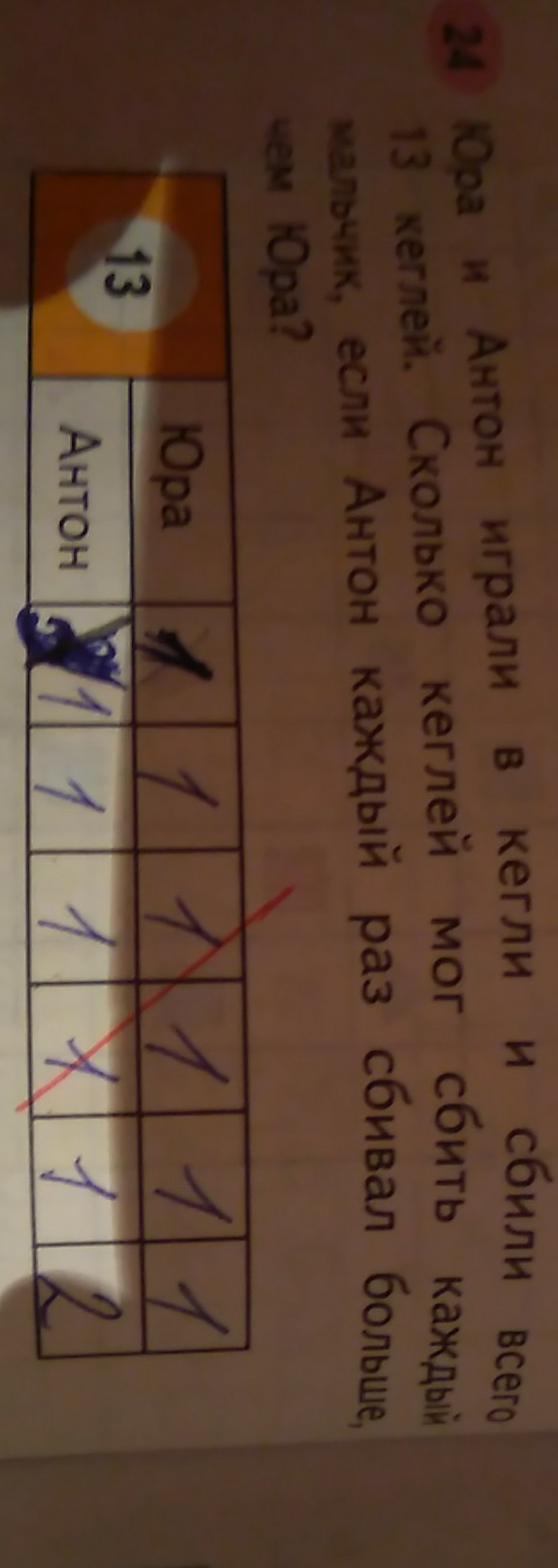 юра и антон играли вкегли и сбили всего 13 кеглей.сколько кеглеймог сбить каждый мальчик,если антон каждый раз сбивал больше чем юра