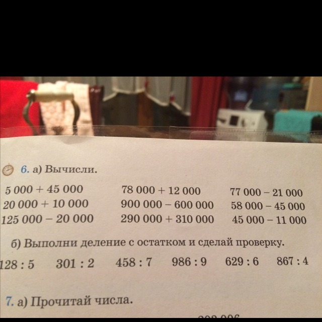 б) 128:5=25(ост 3), 301:2=150(ост. 1), 458:7=65(ост. 3), 986:9=109(ост. 5), 629:6=104 (ост. 5), 867:4=216(ост. 3)