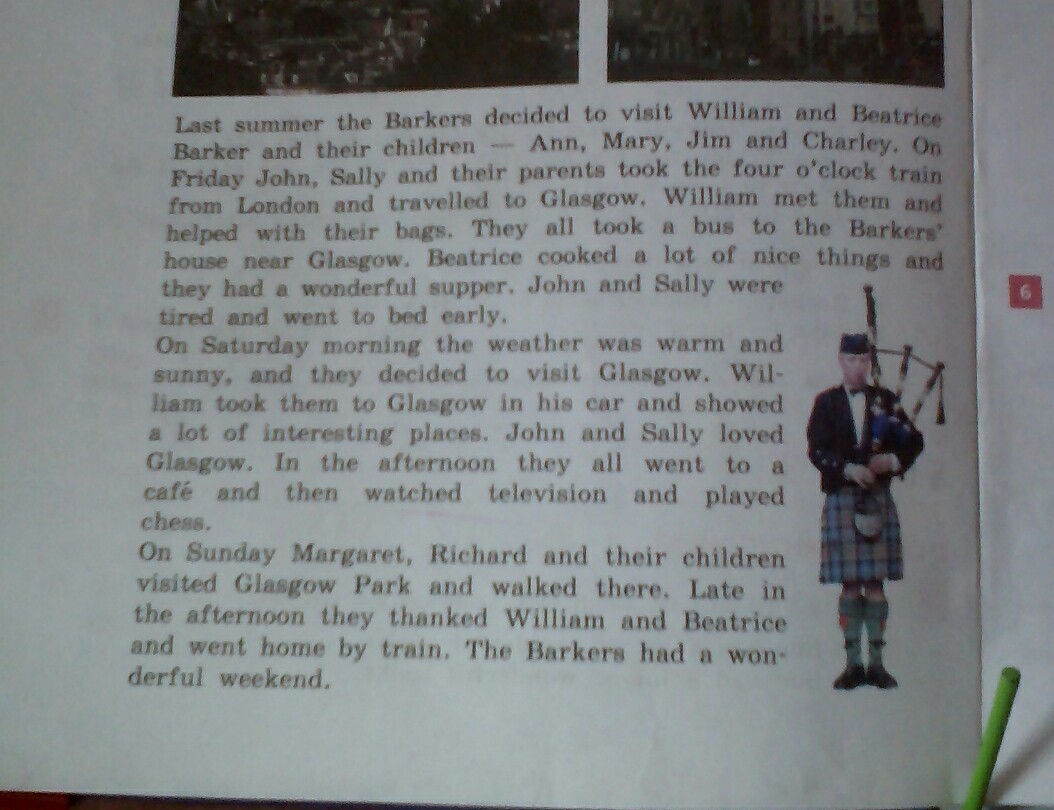Прошлым летом Бэйкерсы решили Уильяма и беатрикм байкер и их детей Анну, Мэри, Джима и Чарли. Ы пятницу Джон, Салли и их родители если на четырехчасоврй поезд из Лондона и поехали в Глазго. Уильям встретил их и помогли им м багажом. они все направились на автобусе к дому байкеров, около Глазго. беатрикс приготовила много вкусных вещей и сделала замечательный ужин. Джон и Салли устали и пошли спать рано. в субботу утром погода была теплой и солнечной и они решили посетить Глазго. Уильям ответ их в глазго на своей машине и показал много интересных мест. Джон и Салли понравился Глазго. после обеда они все поехали в кафе, потом смотрели телевизор и играли в шахматы. в воскресенье Маргарет, Ричард и их дети посетили парк Глазго и погуляли здесь. позже после обеда они поблагодарили Уильяма и беатрикс и вернулись домой на поезде. бжйкерсы повели замечательные выходные.