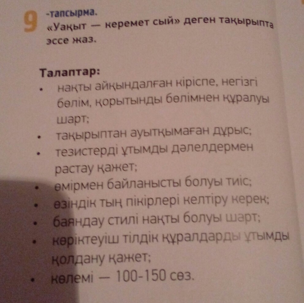 уақыт керемет сый!Уақыт-минуттардан секундтардан құралған бізге берілген тамаша мүмкіндік.Біз бұл уақытты өмірімізді əсем,əдемі қып өткізу үшін пайдаланамыз.Мысалы,ата анамызға көмектесуге,құрбыларымызбен серуендеуге,салауатты өмір салтын ұстануымызға жəне күнделікті сабағымызды үлгілі саналы түрде оқуымызға жұмсаймыз.Алтын уақытымызды тиімді,ұқыпты пайдалана білейік.Менің өз уақытым тамаша өтуде.