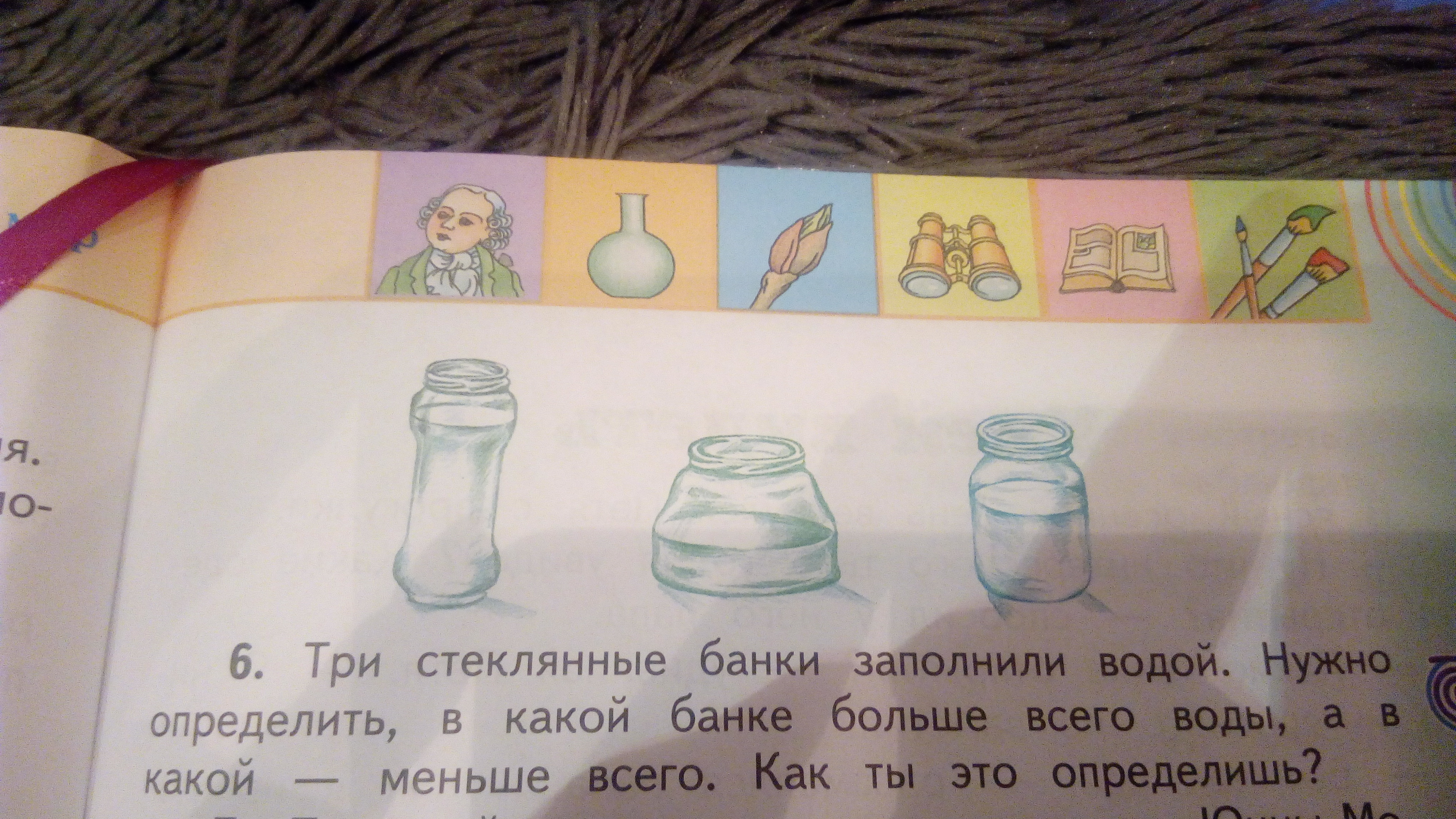 Три стеклянные банки заполнили водой. Нужно определить в какой банке больше всего воды.а в какой меньше всего. Как ты это определишь. ?