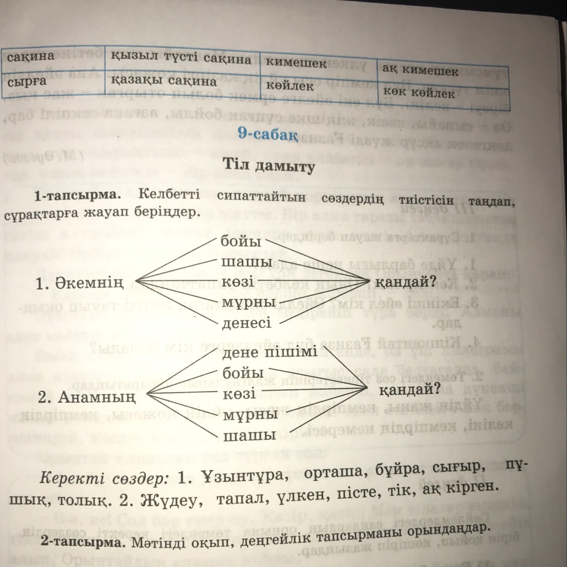 Әкемің бойы ұзынтұра. Шашы бұйра. Көзі сығыр. Мұрны пұшық. Денесі толық.