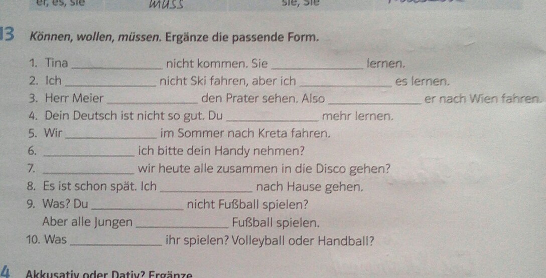 Задание к упражнению, слова помощи : Können, wollen, müssen. Ergänze die passende Form