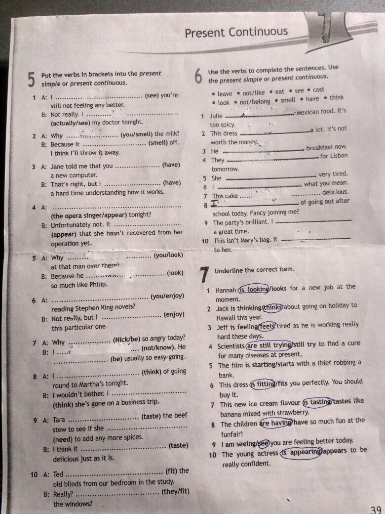 see,actually saw,do your smell,is smelling,have(два раза подряд),this is opera singer and appear,it is appearing,do you looking,look,do you enjoying,enjoy,Nick was,don't know,was,think is,thinks,tasted and needs,tastes,cited,they fited