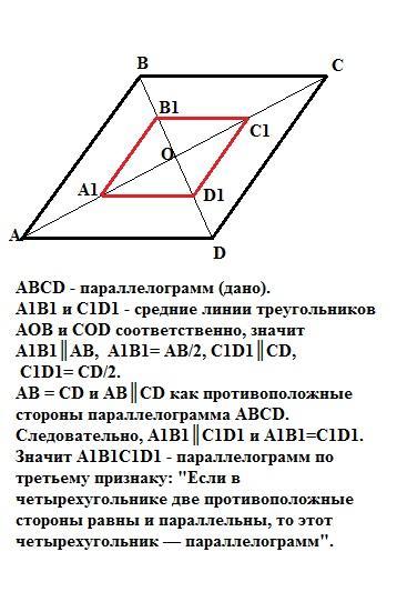 Диагонали параллелограмма ABCD пересекаются в точке О. Докажите, что четырехугольник А1B1C1D1, вершинами которого являются середины отрезков ОА, OB, ОС и ОD является параллелограммом