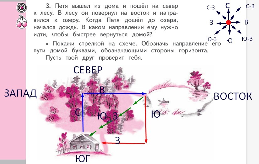 Петя вышел из дома и пошёл на север к лесу, в лесу он повернул на восток и направился к озеру. Когда Петя дошёл до озера начался дождь. В каком направлении ему нужно идти чтобы вернутся домой?