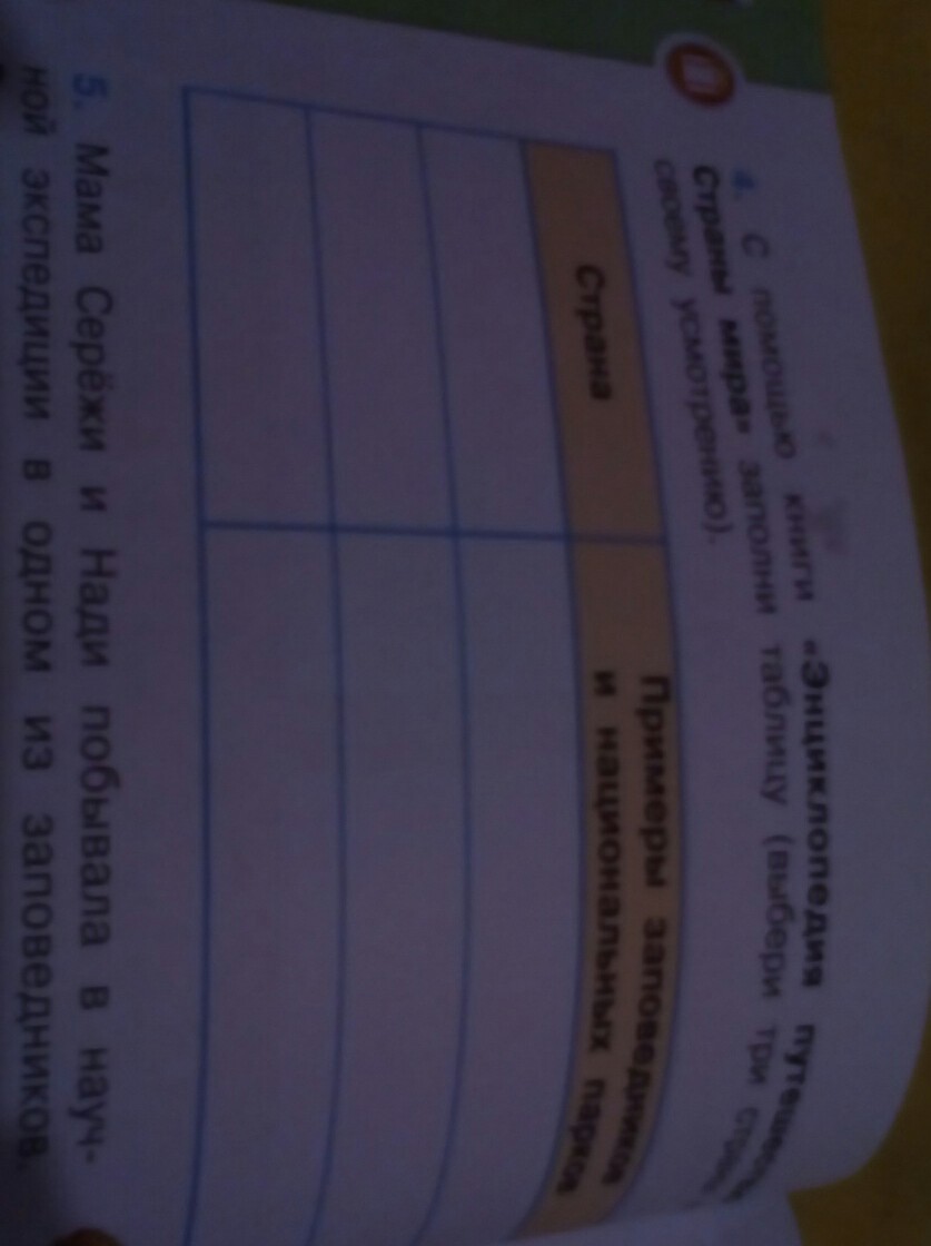 В первом столбике ты пишешь здесь любую страну три любые страны а во втором столбике. Пишешь заповедные или национальные парки. Любой пример