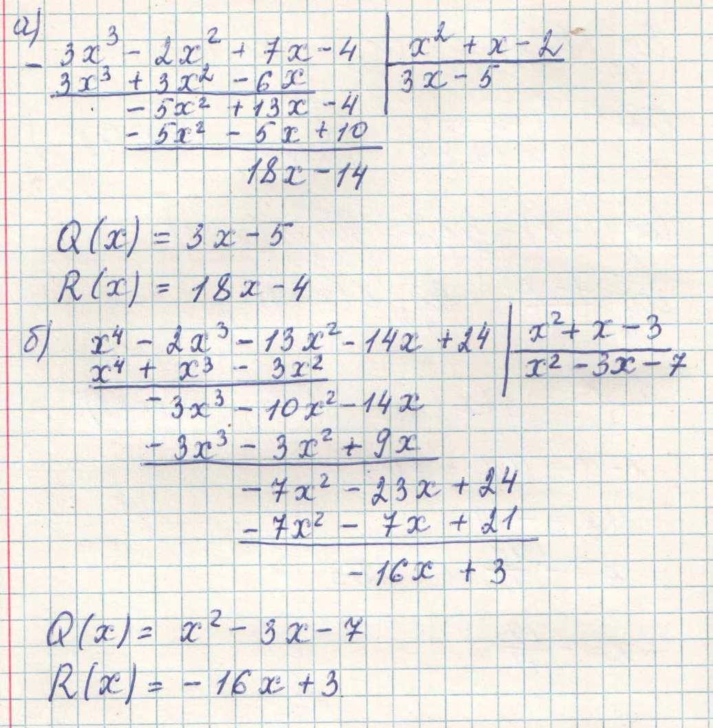 Разделите уголком многочлен А(х) на многочлен В(х) укажите неполное частное Q(x) и остаток R(x) , если : a) A(x)=3x^3-2x^2+7x-4 B(x)=x^2+x-2