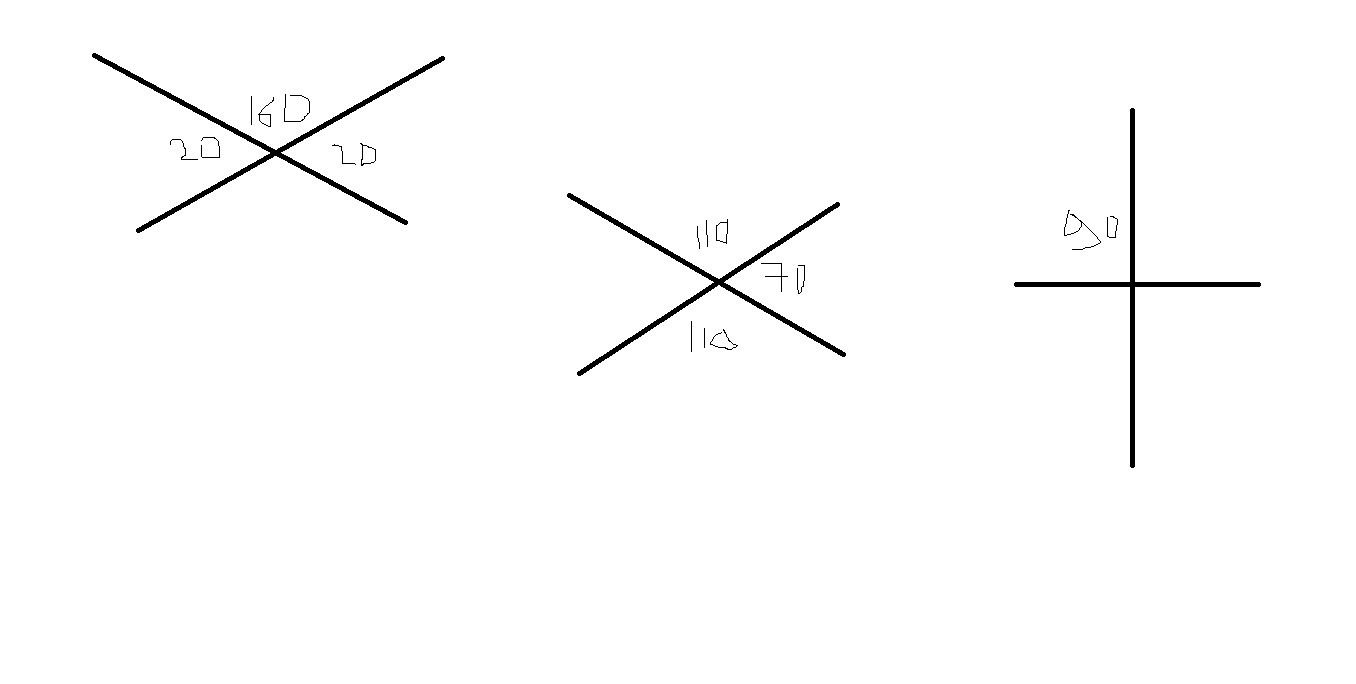 Один из углов , образовавшихся при пересечении двух прямых , равен а)20°,б)110°,в)90°. найдите остальные три угла , помогите пж !!!