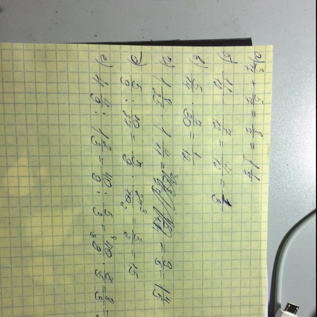 Выполните действия: а) 3/7+5/7 б) 11/12-7/12 в) 5/14*7/30 г) 1 8/25*1 4/11 д) 5/9:10/27 e) 4 4/9:1 2/3