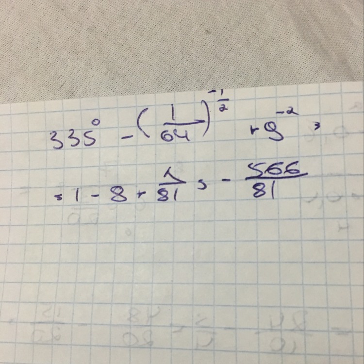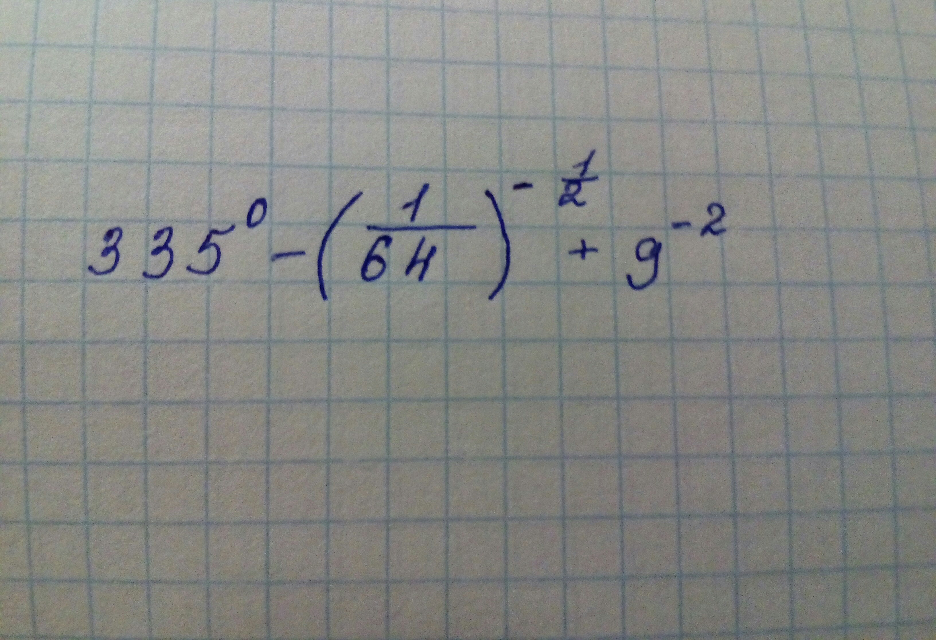 335^0 - (1/64)^(-1/2) + 9^(-2) =