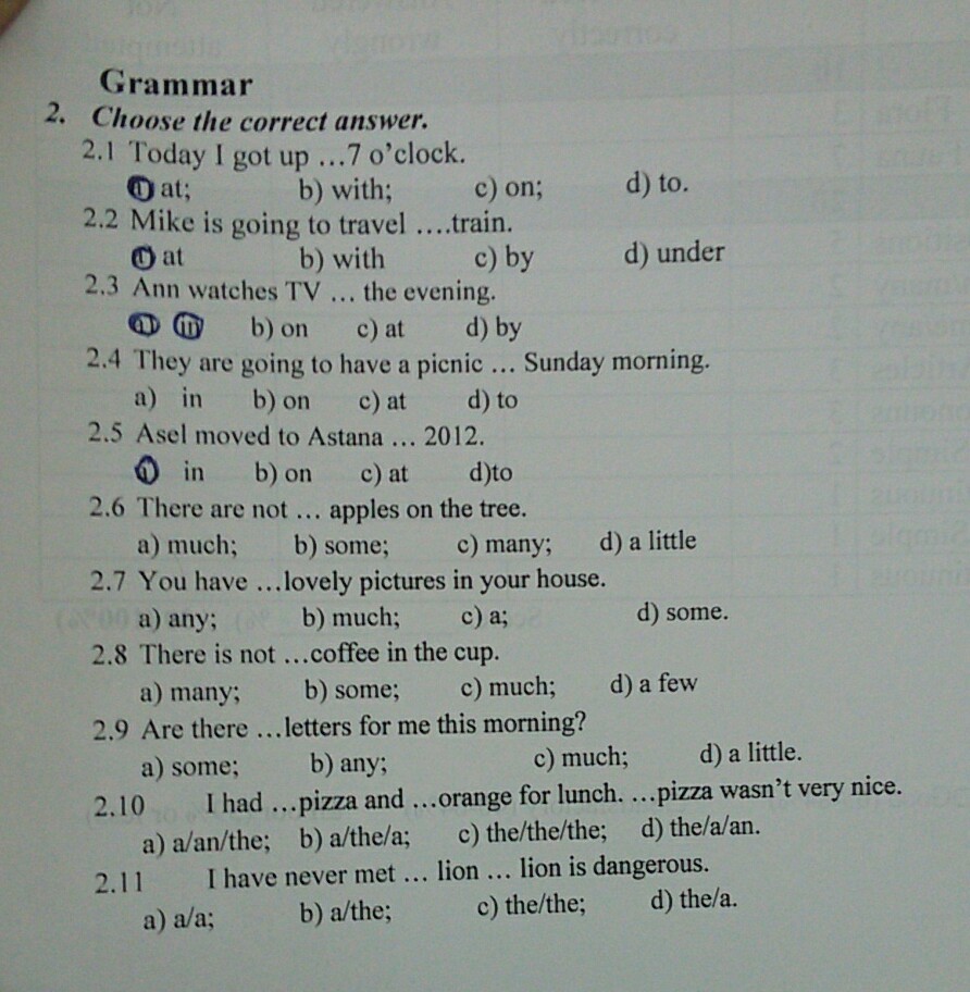 1. at 2 by 3 in 4.on 5.in 6. many 7. some 8.much 9. any 10. a 11.b