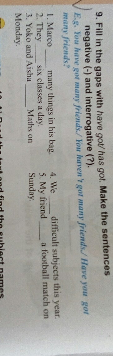 1. Marco haven’t got many things in his bag. Have Marco got many things in his bag? 2. They haven’t got six classes a day. Have they got six classes a day? 3. Yoko and Aisha haven’t got Maths on Monday. Have Yoko and Aisha got Maths on Monday? 4. We haven’t got difficult subjects this year. Have we got difficult subjects this year? 5. My friend haven’t got a football match on Sunday. Have my friend got a football match on Sunday?