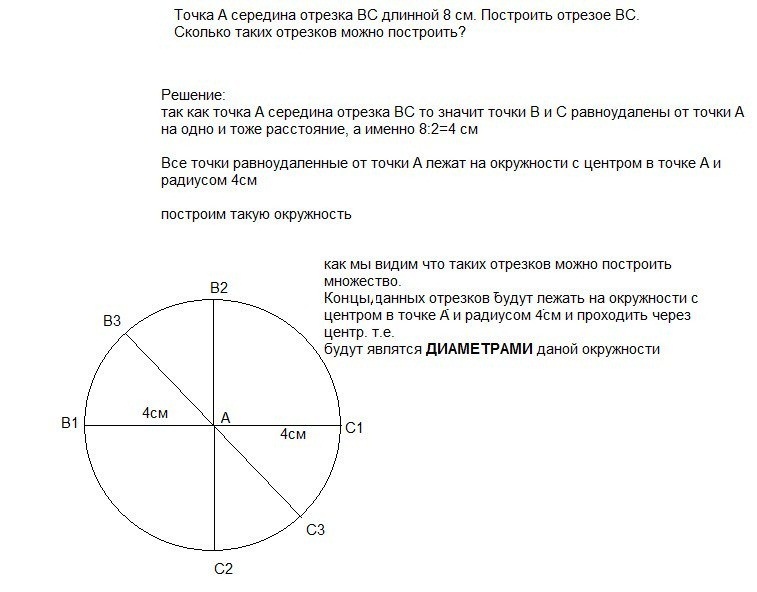 Точка А-середина отрезка ВС длиной 8см.Построй отрезок ВС.Сколько таких отрезков можно построить?