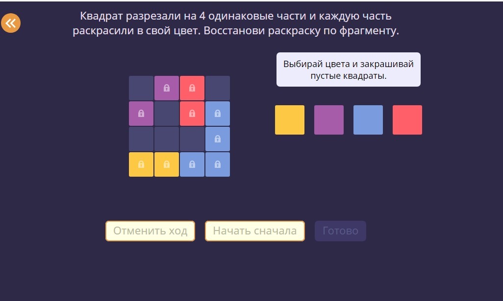 Левая половина квадрата разрезана точно так же, как и правая, только на место синих клеток становятся жёлтые, остаток дополнить сиреневыми.