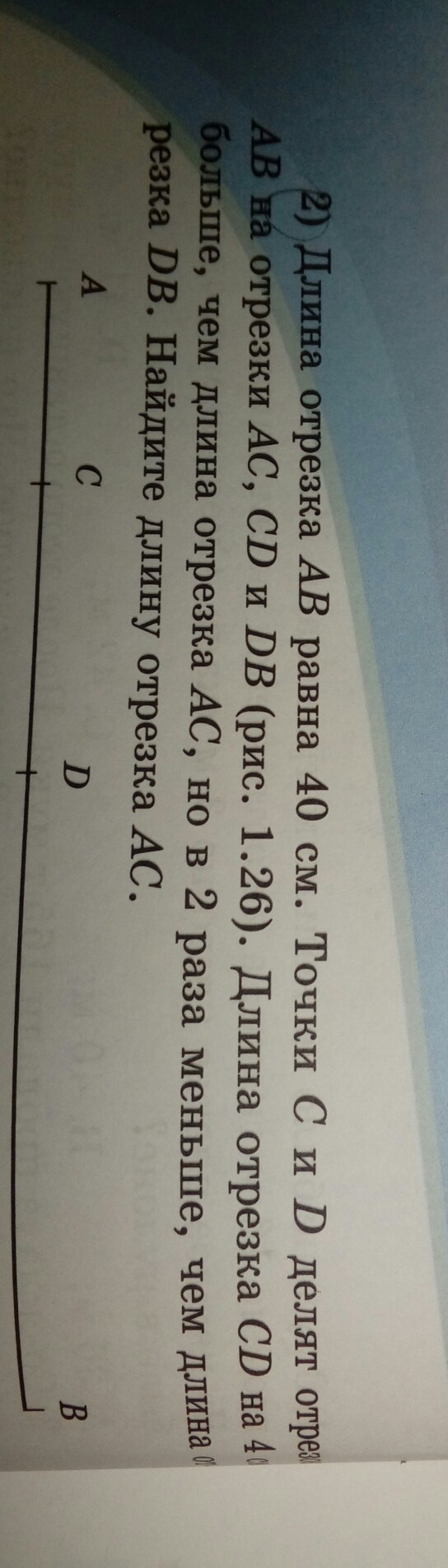 1)АС+СD+DB=AB,2)x+x+4+2(x+4)=40,3)2x+4+2x+8=40,4)4x=40-12,5)4x=28.Ответ: х=7см