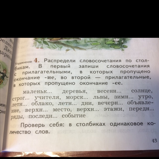 Распредели слова сочетания по столбиком В первый запиши слова сочетание с прилагательными в которых пропущена окончание ие во второй прилагательное в которых пропущена окончание ее