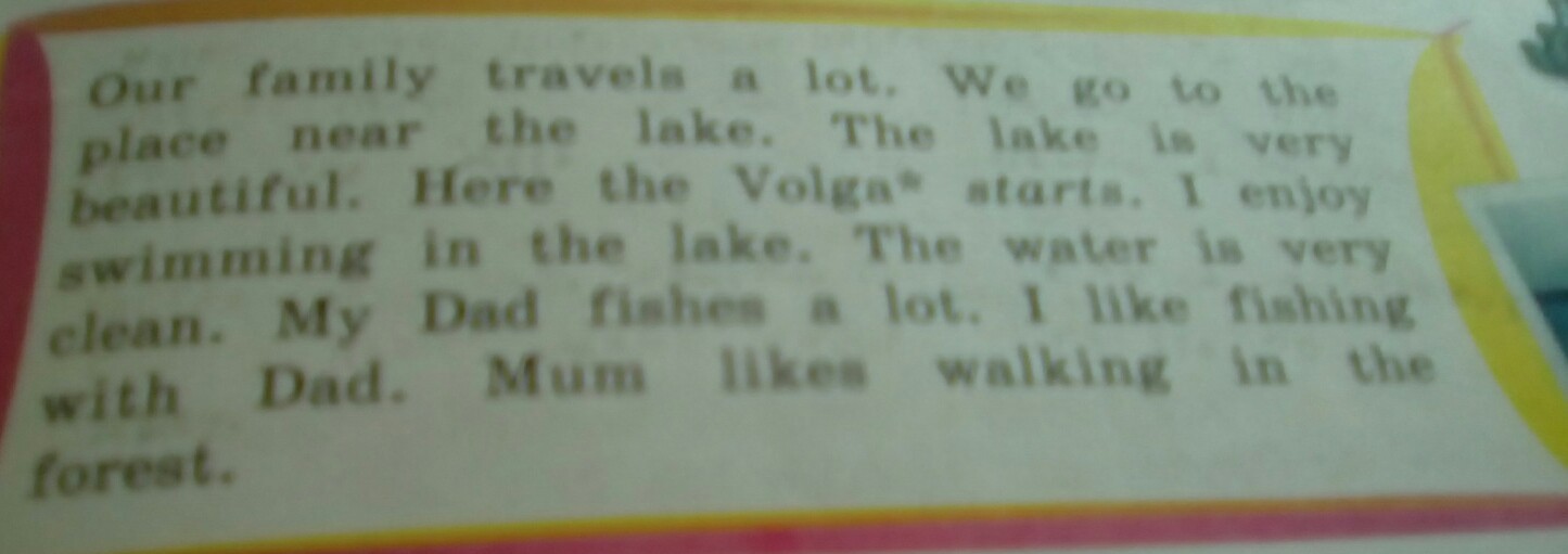 Наша семья много путешествует. Мы идем месту рядом с озером. Озеро очень красивое. Здесь начинается Волга. Мне нравится плавать в озере. Вода очень чистая. Мой папа много рыбачит. Я люблю рыбачить с ним. Мама любит гулять в лесу.