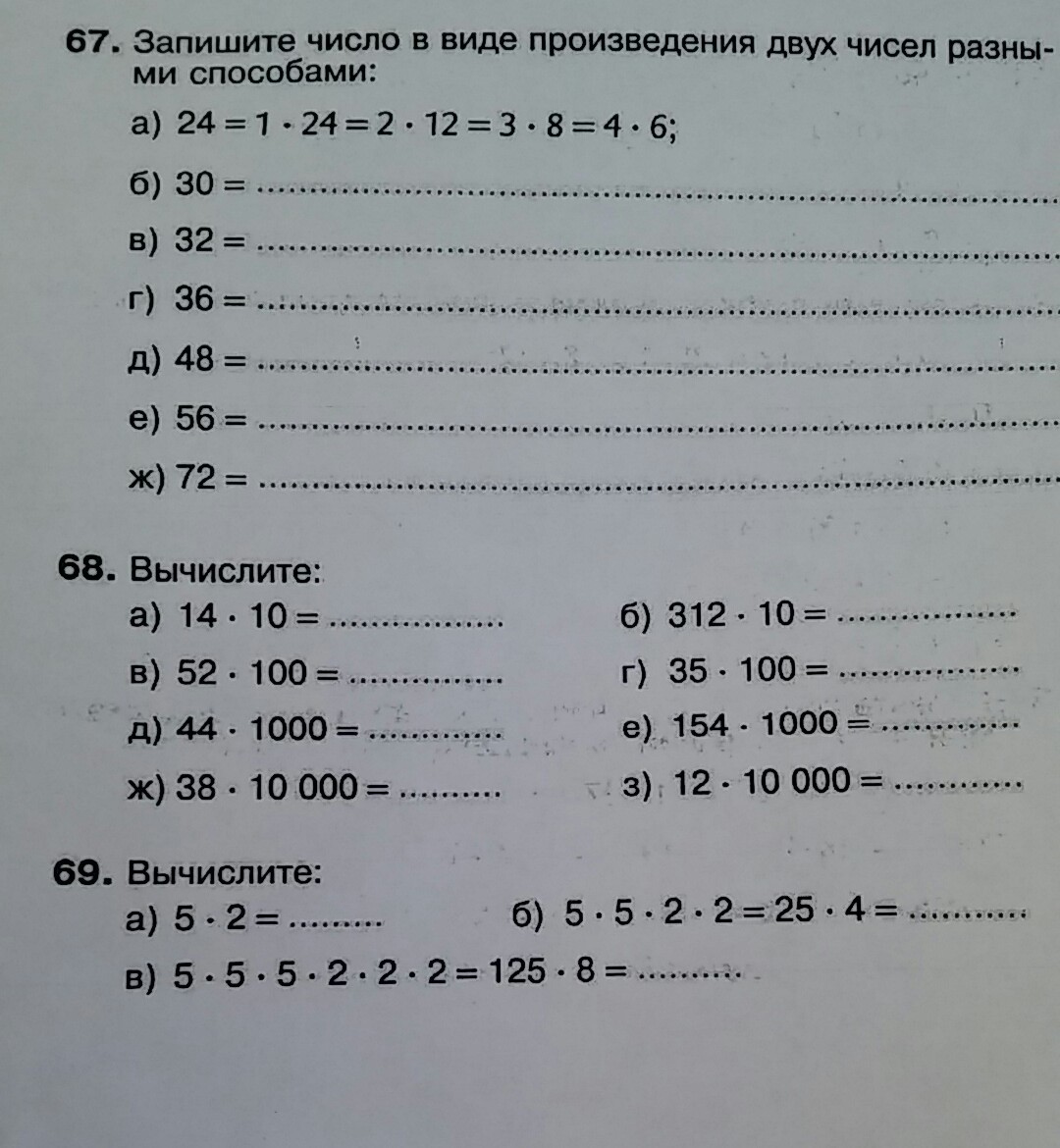 68) а)14•10=140; б)312•10=3120;в)52•100=5200; г)35•100=3500; д) 44•1000=44000; е) 154•1000=154000; ж) 38•10 000=38 0000; з) 12•10 000=12 0000. 69)а) 5•2=10; б)5•5•2•2=25•4=100; в) 5•5•5•2•2•2=125•8=1000. 67) б) 30= 1•30=2•15=3•10=5•6 в)32=1•32=2•16=4•8; г)36=1•36=2•18=4•9=6•6; д)48=1•48=2•24=3•16=4•12=6•8; е) 56=1•56=2•28=4•14=7•8; ж) 72=1•72=2•36=3•24=4•18=6•12=8•9.