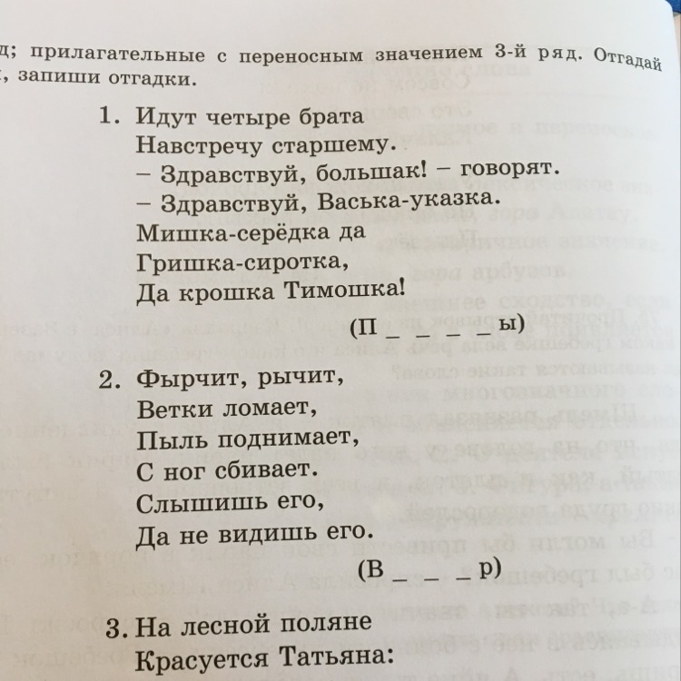 Первый ряд существительные с переносным значением второй ряд глаголов переносным значением третий ряд прилагательные в переносным значением отгадай загадку загадку запиши отгадки