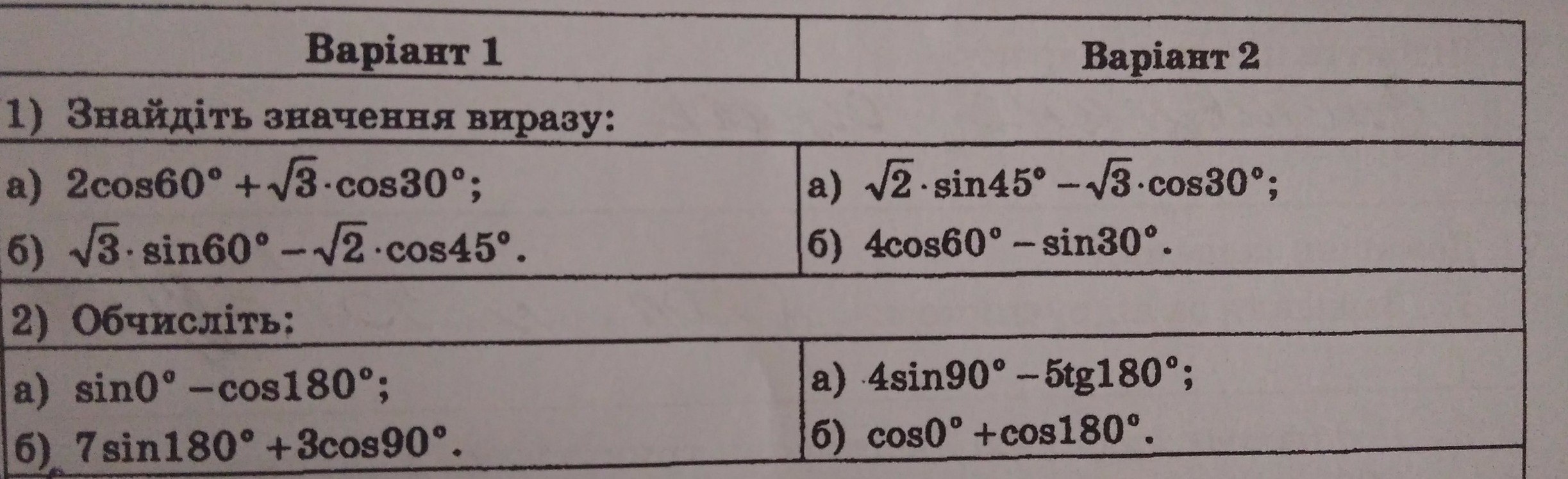 1a) √2*Sin45° - √3* Cos30° = √2* 1/√2 - √3* √3/2 = 1 - 3/2 = - 0,5 б)4Cos60° - Sin30° = 4*1/2 - 1/2 = 1,5 в) 4Sin90° - 5tg180° = 4*1 - 5*0= 4 г)Cos0° + Cos180° = 1 - 1 = 0
