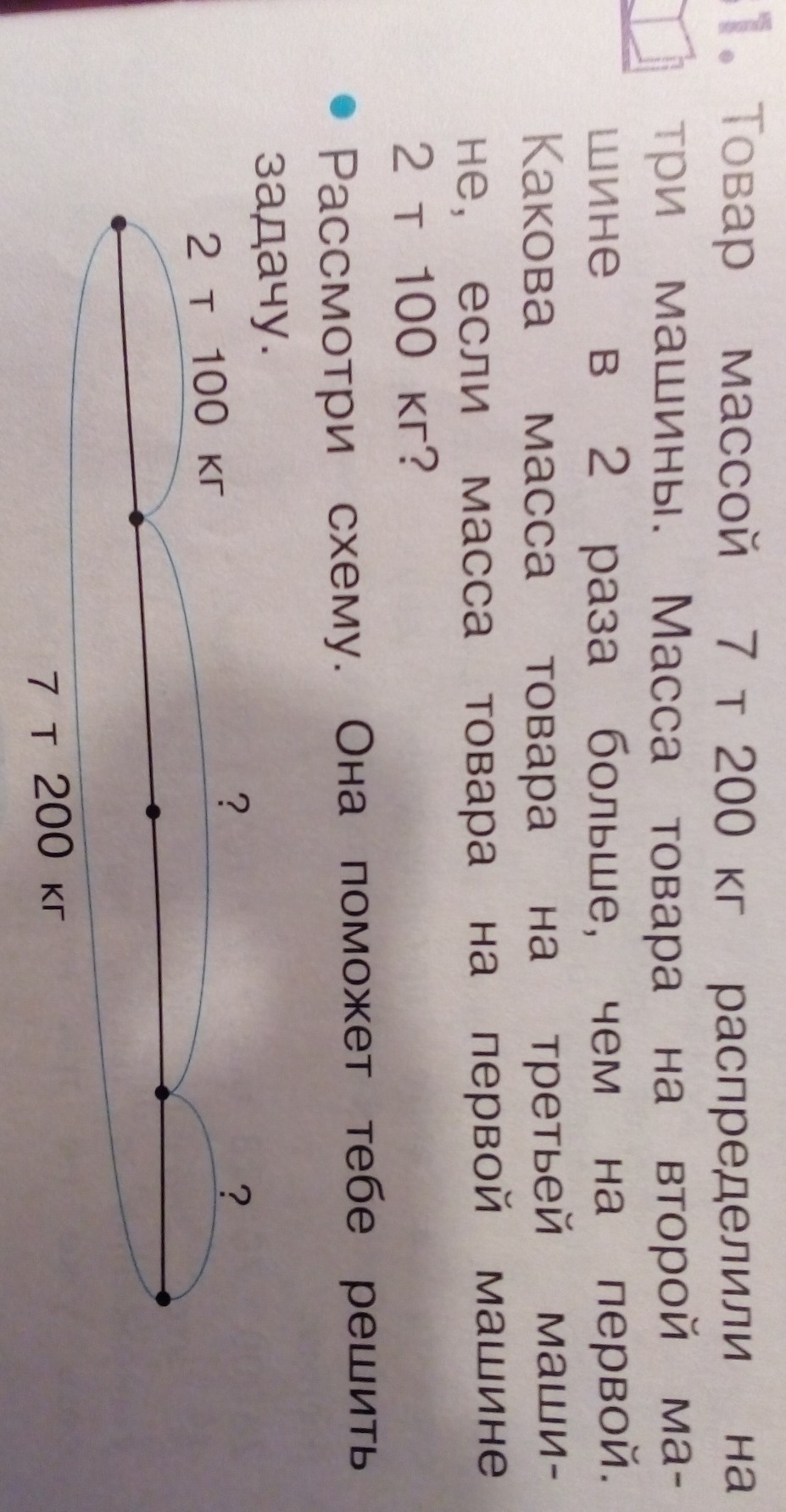 7т 200 кг -4т 200 кг- 2т100кг= 3т-2т 100 кг=2т1000кг-2т 100кг= 900кг масса товара на 3 машине