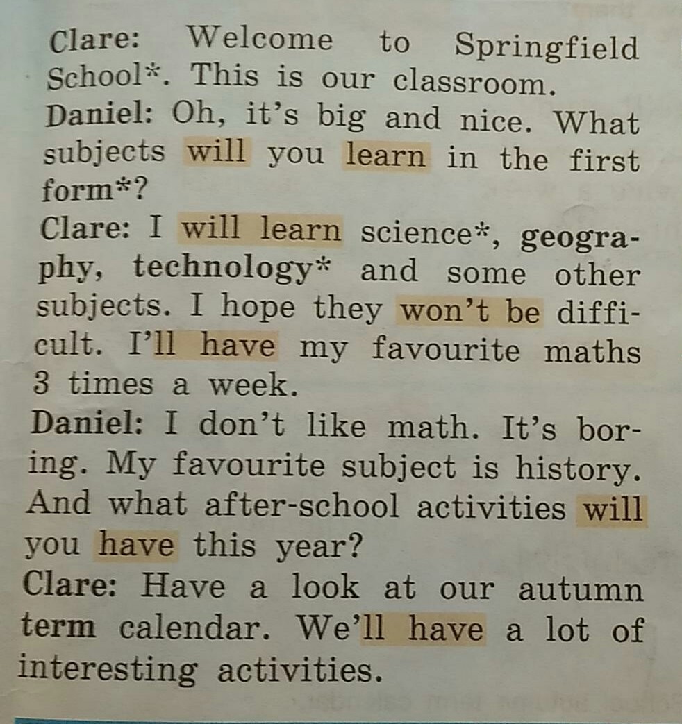 Клэр : Я буду изучать науку (естественные науки ), географию, технологию (труд ) и некоторые другие предметы. Я надеюсь, что они не будут сложными. У меня будет проводиться 3 раза в неделю моя любимая (мой любимый предмет) математика.