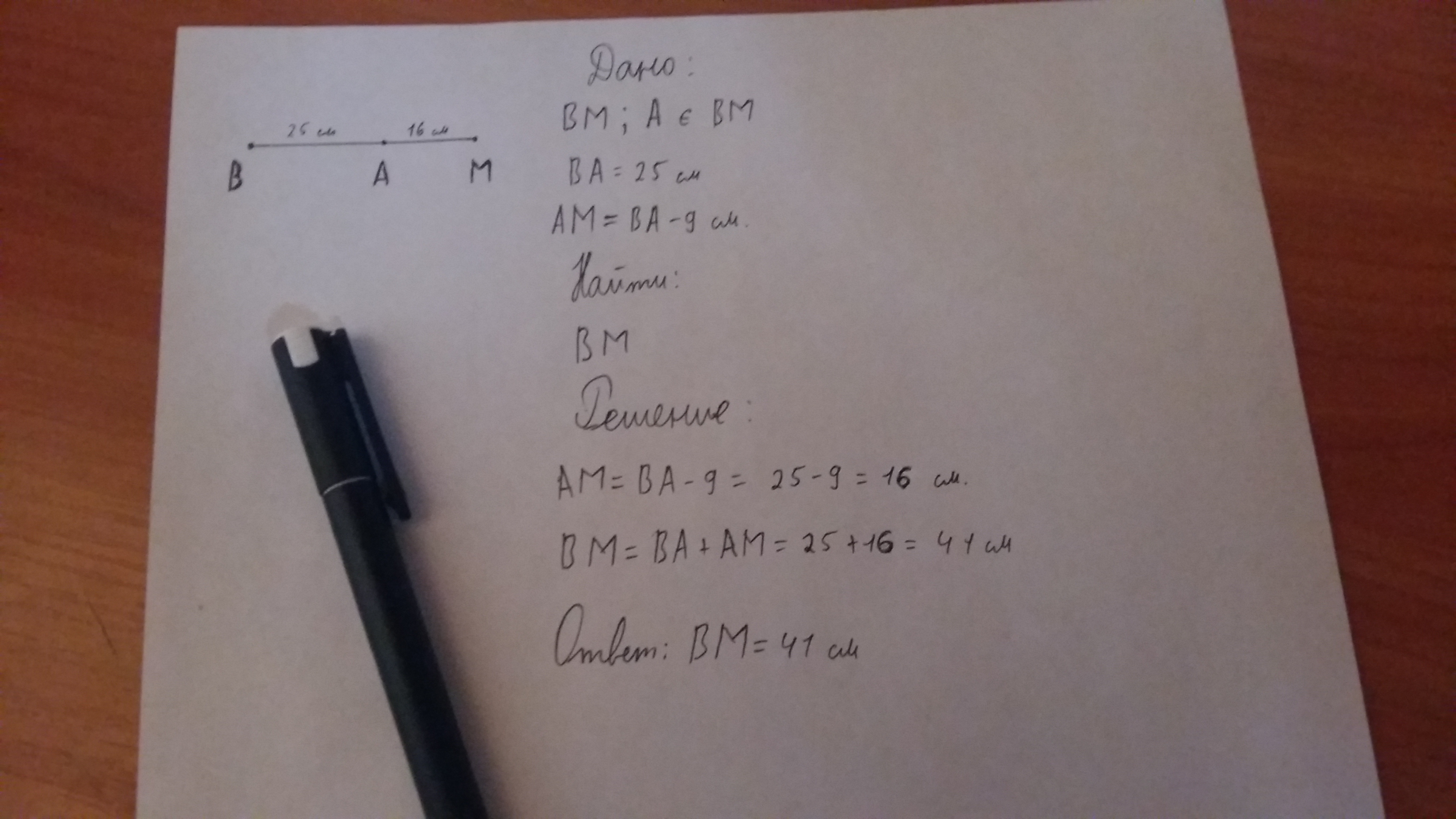 Точка A принадлежит отрезку BM, BA=25 см, отрезок AM на 9 см меньше отрезка BA.Найдите длину отрезка BM.