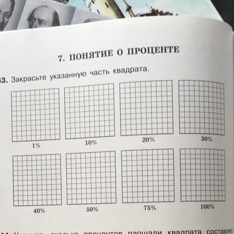 1%- 1 квадратик, 10%- 10 квадратиков, и тд, в квадрате 100 квадратиков, делим 100% на 100 квадратив и получаем 1, тоесть в 1% 1 квадратик