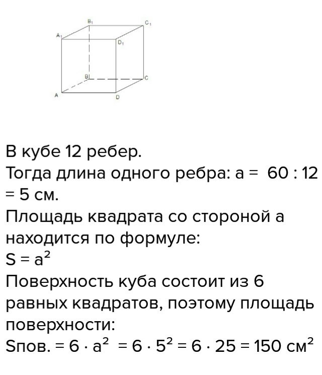Найдите площадь поверхности куба если сумма длин всех его ребер 60 см,а площадь квадрата со стороной а находится по формуле S=a в квадрате
