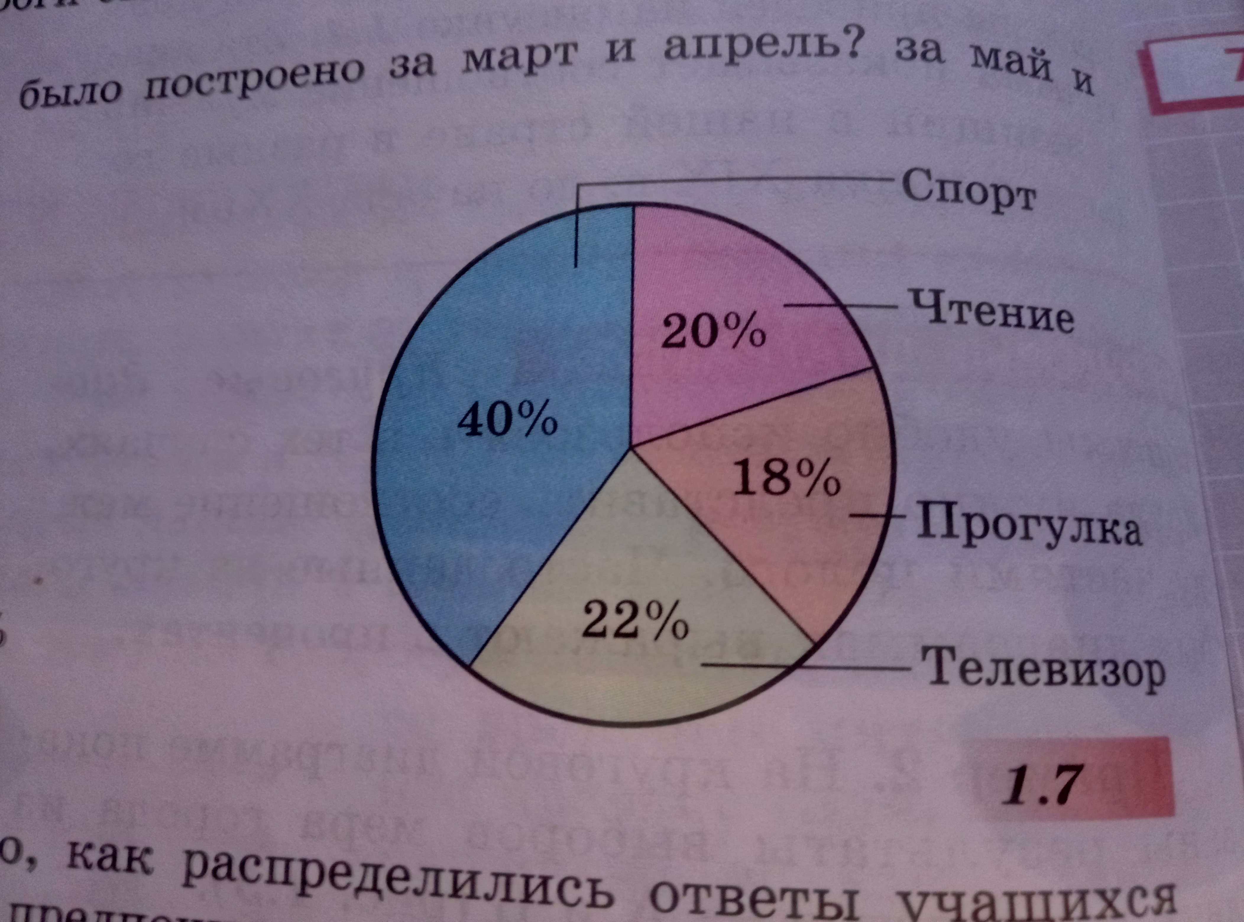 На диаграмме (рис. 1.7) показано, как распределились ответы учащихся на вопрос: "Какой вид досуга вы предпочитаете: чтение, просмотр телепередач, занятия спортом, прогулка на свежем воздухе?" Каждый должен был выбрать только одно из этих занятий.