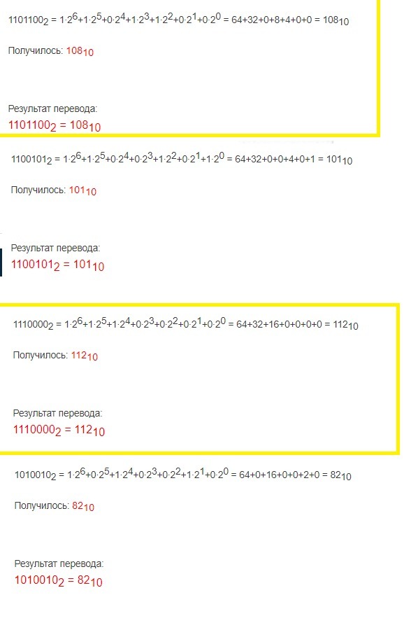 Переведите числа из "2" системы счисления в "10"-ную а) 1101100 б) 1100101 в) 1110000 г) 1010010