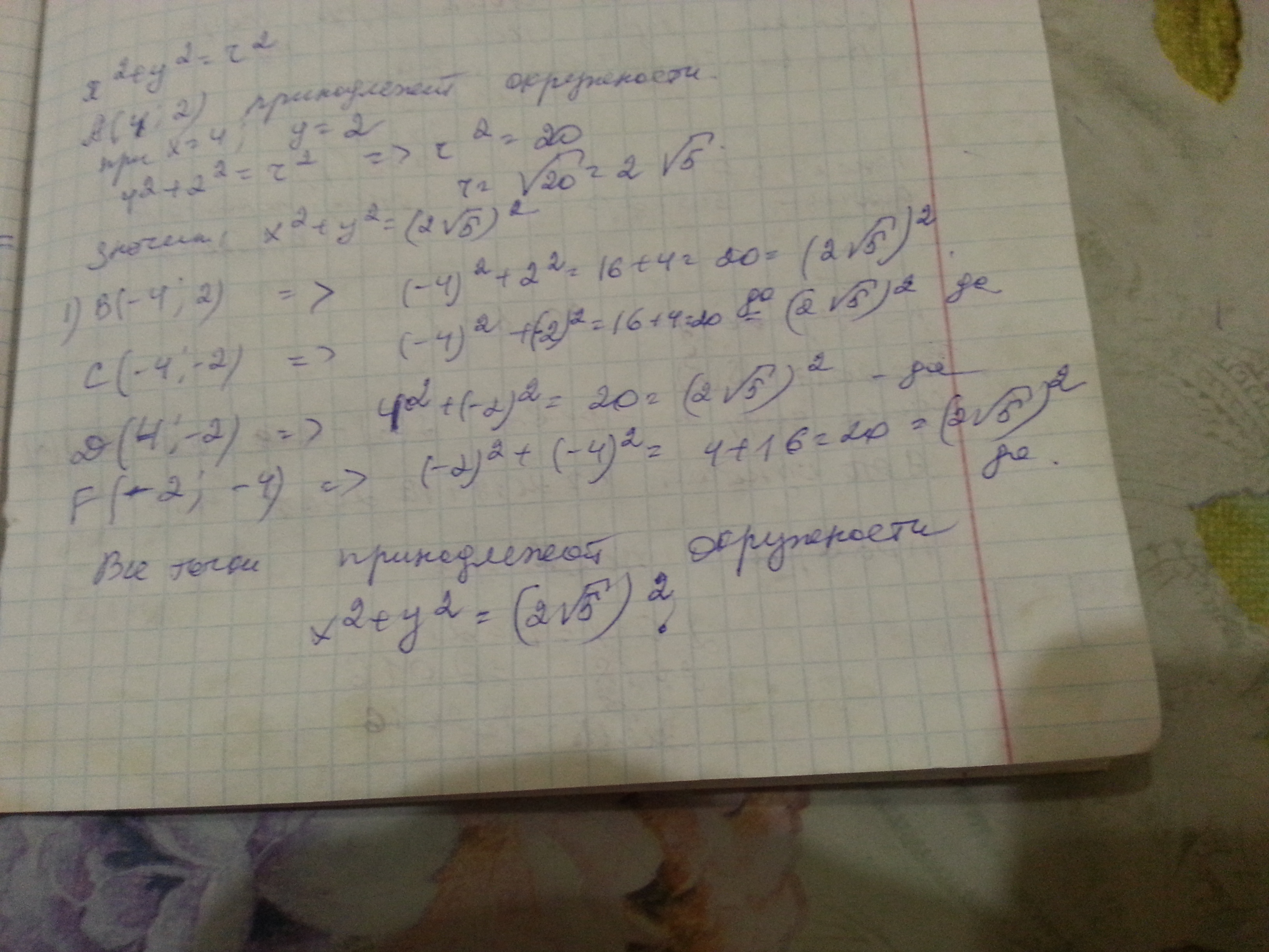 Известно , что окружность x^2+x^2=r^2 проходит через точку А(4;2) . Проходит ли эта окружность через точку C(-4;-2); D(4;-2); E(2;4); F(-2;-4) ?