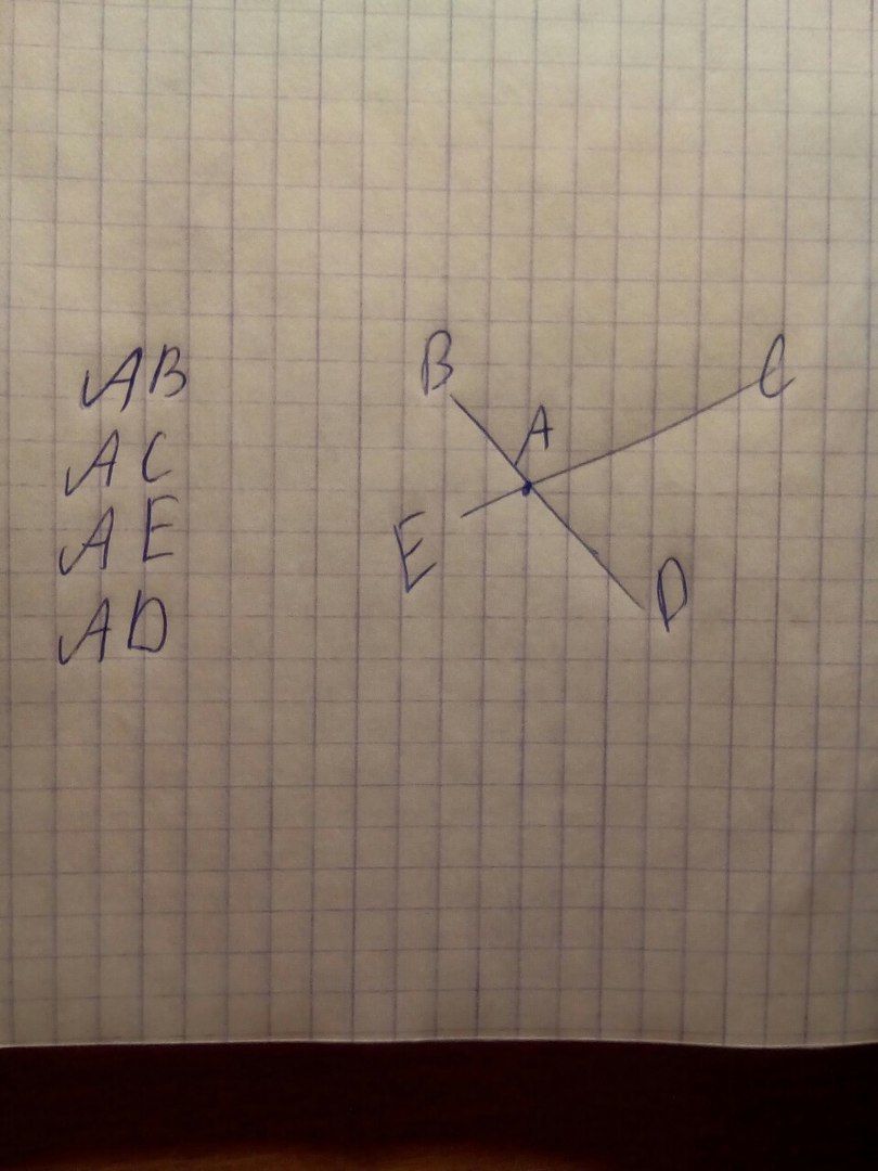 отметьте точку А и Проведите через неё две различные прямые. Обозначьте и запишите получившиеся лучи.