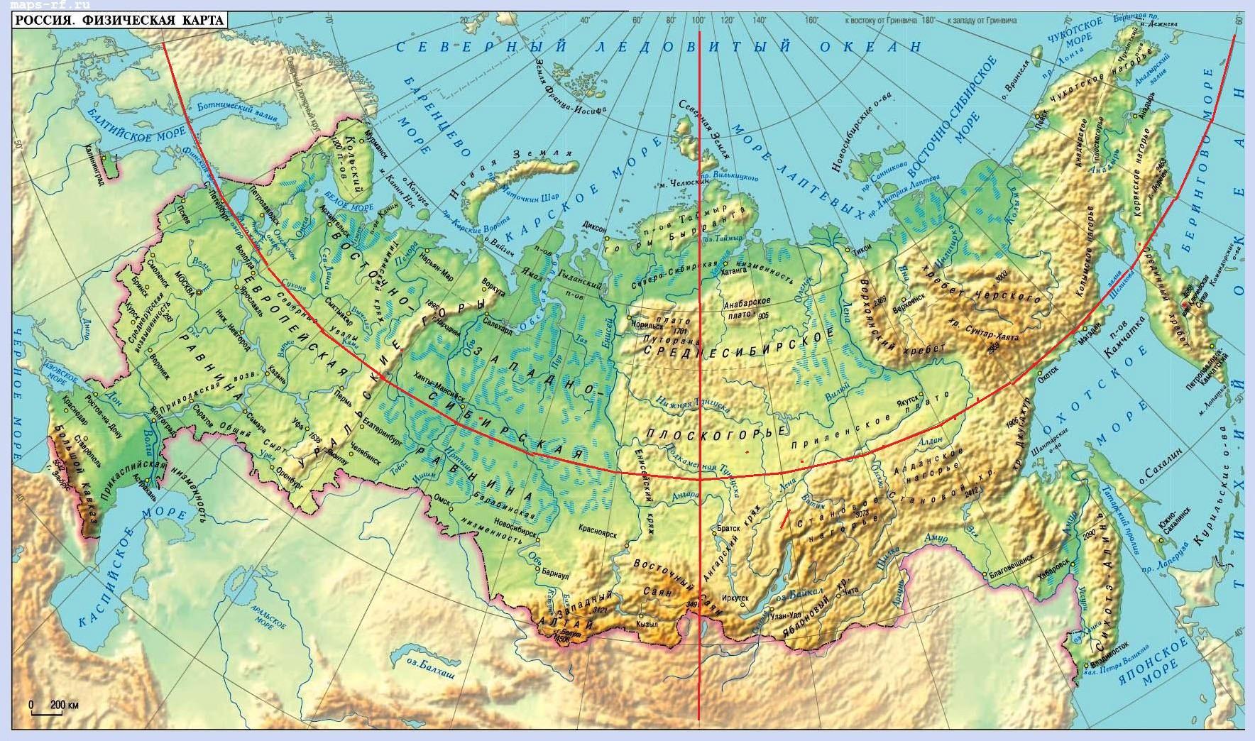 Определите по карте в атласе протяжённость России (в км и градусной мере):