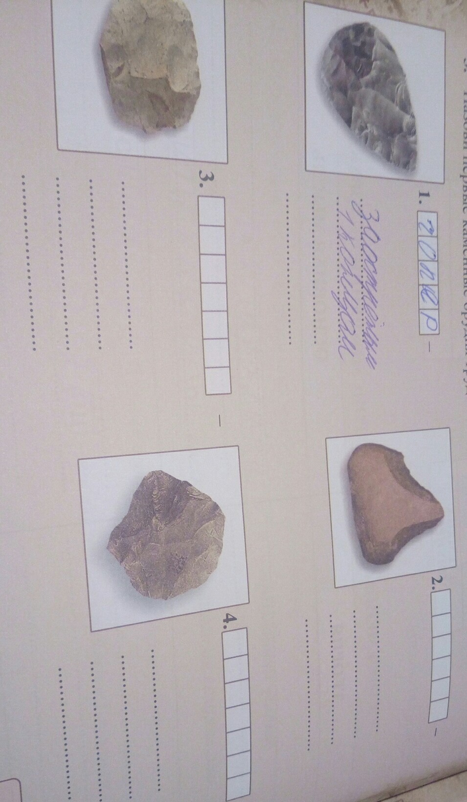 1 Топор , 2 Рубило , 3 Скребок , 4 Кремень .