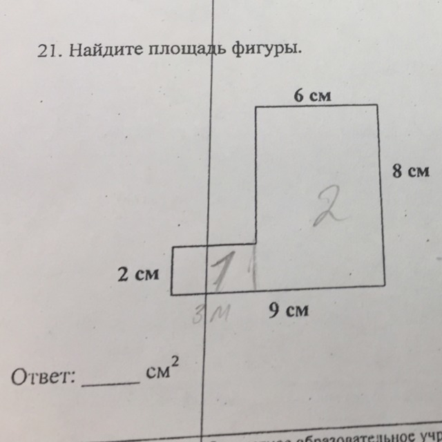 Помогите пожалуйста найти площадь этой фигуры! И объясните если можно как находить у таких фигур площадь, ибо у меня завтра диагностическая работа (я в 5 классе)