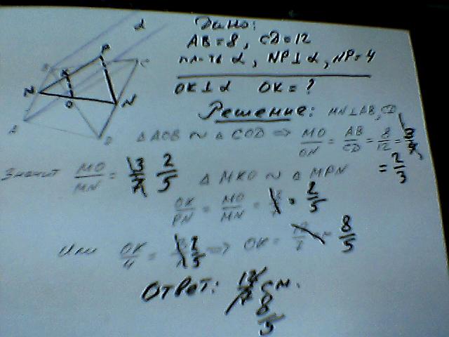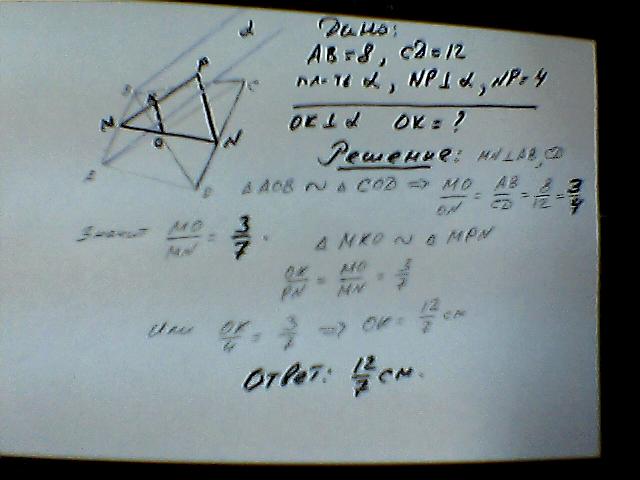 основание трапеции равна 8 см и 12см.через меньшее основание трапеции проведена плоскость,удаленная на 4 см от большего основания.найдите расстояние от точки пересечения диоганалей трапеции до данной плоскости.