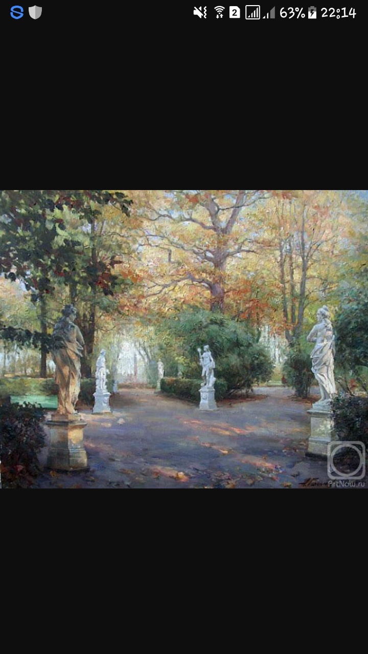 Летний сад осенью, вокруг все разно цветное, деревья ложаться спать и наступает вечер, листья падают на землю и засыхая умерают,а по кругу не возмутимо стоят статуи и терпиливо ждут следующего сезона.