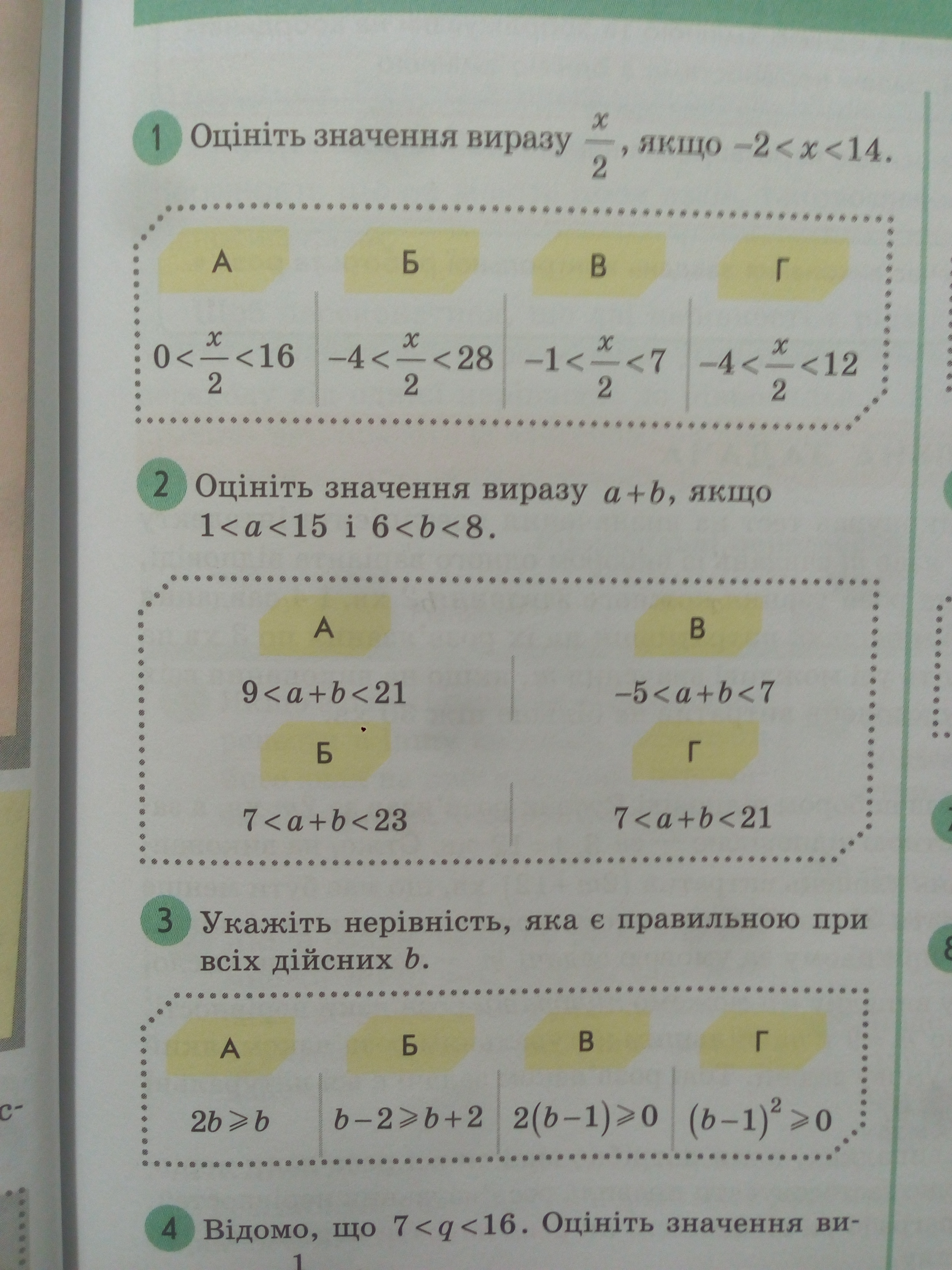 х/2 -2<х<14 ; -2/2<х/2<14/2 -1<х/2<7 В 2. а+в 1<а<15 6<в<8;1+6<а+в<15+8 7<а+в<23 Б 3. Г0 решить не смогу но уверен