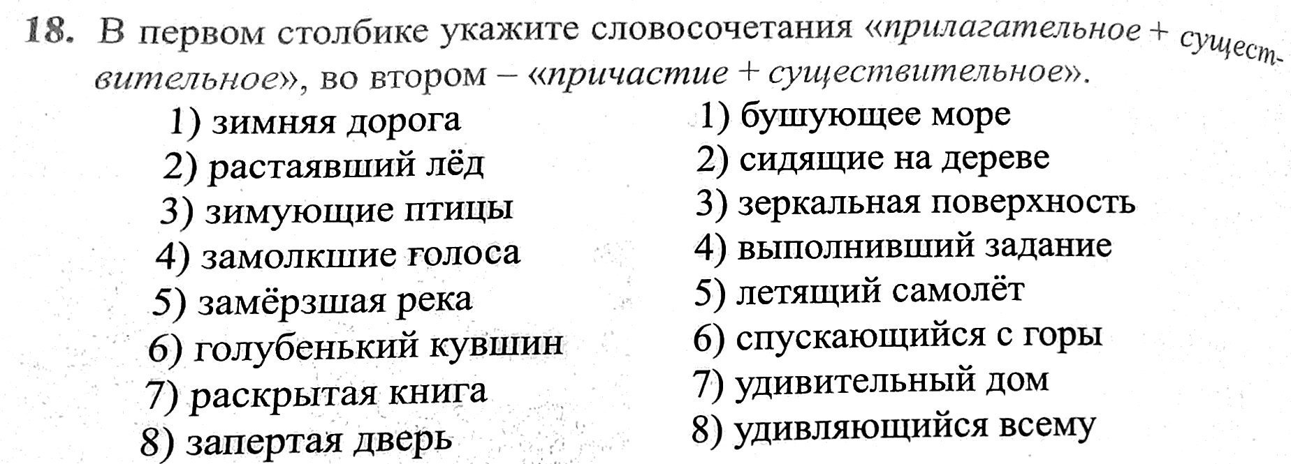 Прич+сущ: 2, 3, 4, 5, 7, 8 (из первого столбца), 1, 2, 4, 5, 6, 8 (из второго)