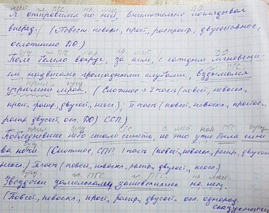 1) Я отправился по ней,внимательно поглядывая вперёд 2)Поле белело вокруг,за ним, с каждым мгновением надвигаясь громадными клубами,вздымался угрюмый мрак 3)Побледневшее небо стало синеть,но это уже была синева ночи 4)Звёздочки замелькали,зашевелились на нём