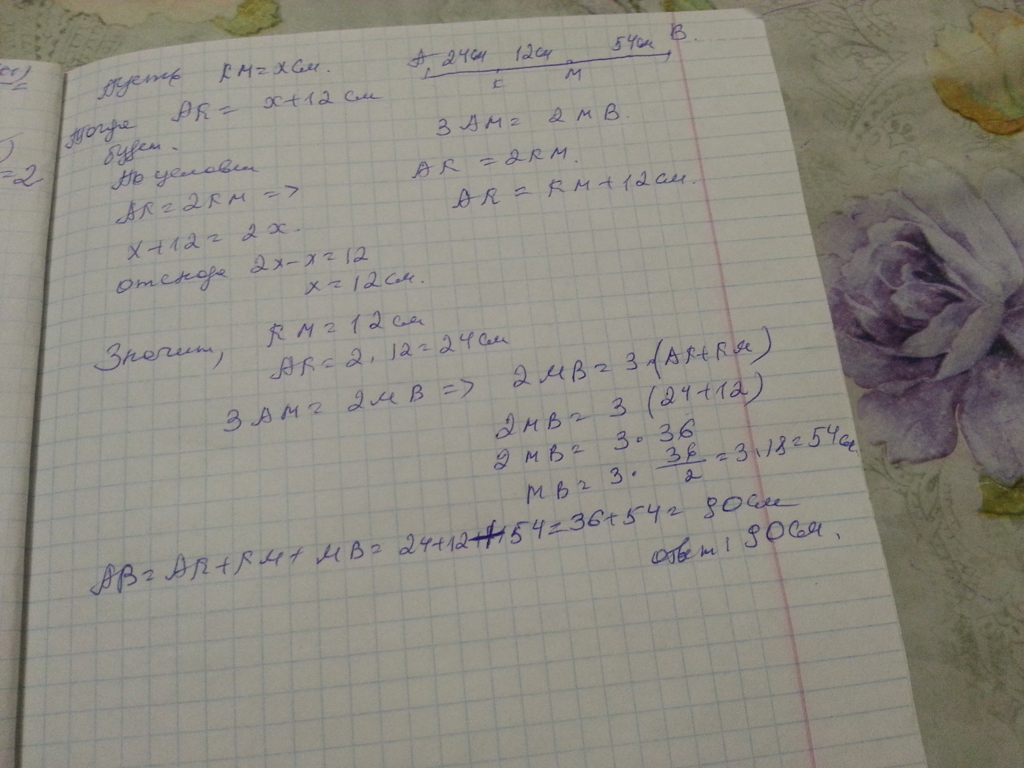 На отрезке AB отмечены точки K и M так что точка K лежит между точками A и M , 3AM=2MB, AK=2KM, отрезокAK на 12 см больше отрезка KM. Найдите растояние между точками A и B