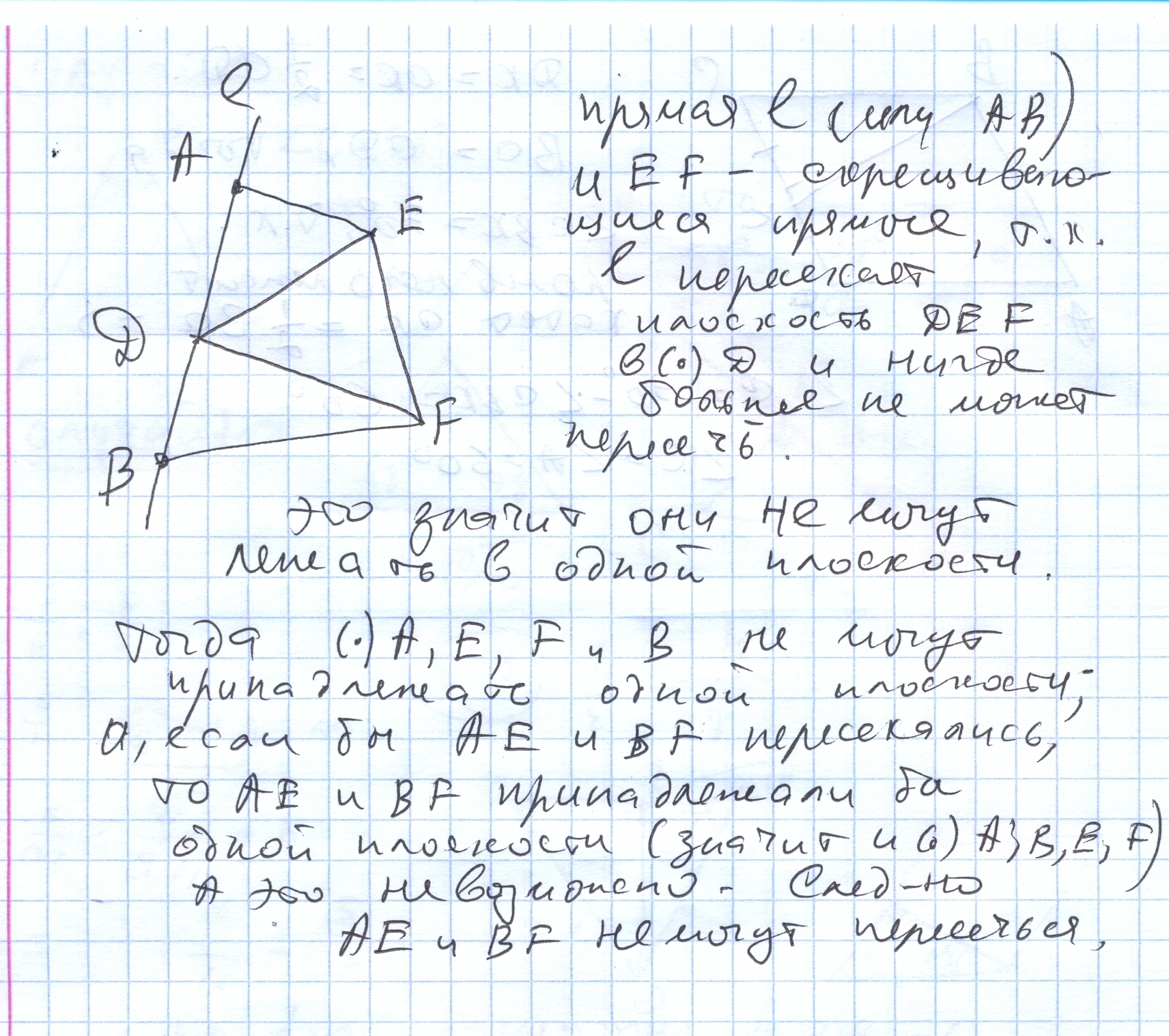 Прямая I пересекает плоскость DEF в точке D. На прямой I отметили точки A и В. Могут ли прямые АЕ и ВF пересекаться?